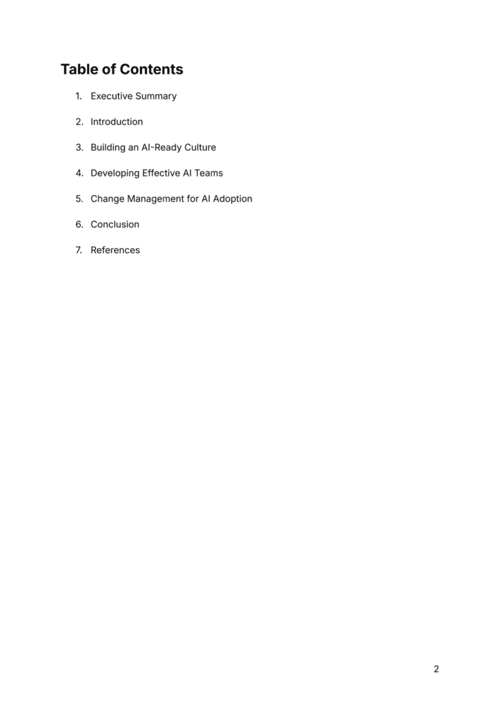 Table of contents from AI-ready organization report outlining culture building, team development, and change strategies